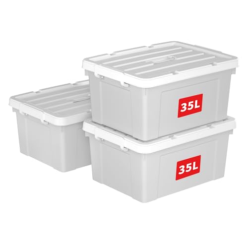 Cetomo 35L*3 Boîte de Rangement, Bac de rangement avec Poignée, Plastique Organisateur avec Couvercle, Empilable, Transportable, pour Vêtements, Bureau, Chambre, Dortoirs, Gris, 35L - Lot de 3