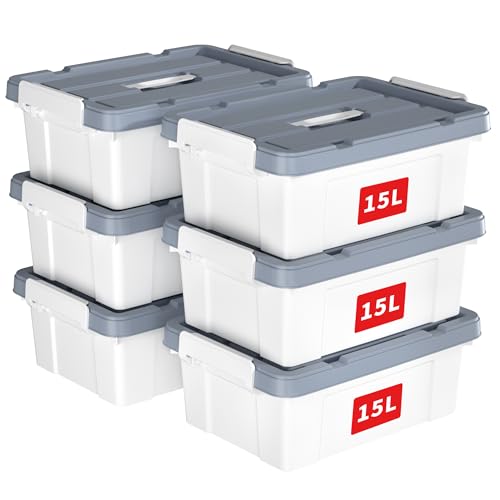 Cetomo 15L*6 Boîte de Rangement, Bac de rangement avec Poignée, Plastique Organisateur avec Couvercle, Empilable, Transportable, pour Vêtements, Bureau, Chambre, Dortoirs, Gris, 15L - Lot de 6