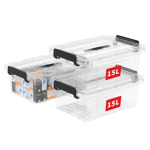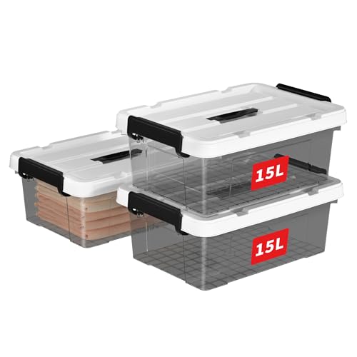 Cetomo 15L*3 Boîte de Rangement, Bac de rangement avec Poignée, Plastique Organisateur avec Couvercle, Empilable, Transportable, pour Vêtements, Bureau, Dortoirs, Transparent Noir, 15L - Lot de 3