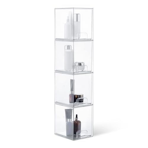 Amazon Basics Tiroirs de Rangement Empilables en Plastique, Organisateur de Maquillage, Transparent, 19.1 x 15.2 x 11.4 cm, Lot de 4