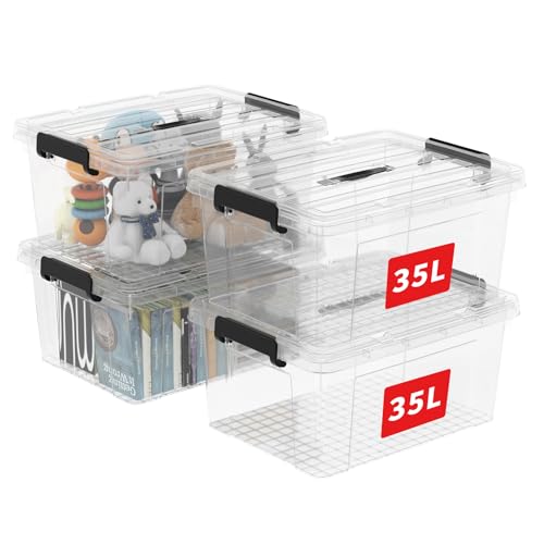 Cetomo 35L*4 Boîte de Rangement, Bac de rangement avec Poignée, Plastique Organisateur avec Couvercle, Empilable, Transportable, pour Vêtements, Bureau, Chambre, Dortoirs, Transparent, 35L - Lot de 4
