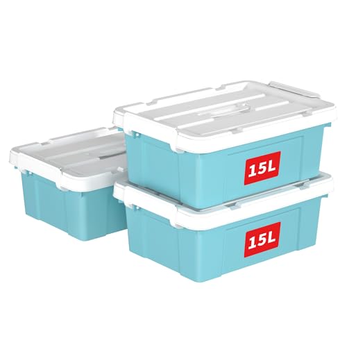 Cetomo 15L*3 Boîte de Rangement, Bac de rangement avec Poignée, Plastique Organisateur avec Couvercle, Empilable, Transportable, pour Vêtements, Bureau, Chambre, Dortoirs, Bleu, 15L - Lot de 3