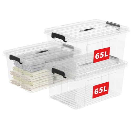 Cetomo 65L*3 Boîte de Rangement, Bac de rangement avec Poignée, Plastique Organisateur avec Couvercle, Empilable, Transportable, pour Vêtements, Bureau, Chambre, Dortoirs, Transparent, 65L - Lot de 3