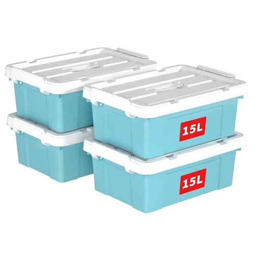 Cetomo 15L*4 Boîte de Rangement, Bac de rangement avec Poignée, Plastique Organisateur avec Couvercle, Empilable, Transportable, pour Vêtements, Bureau, Chambre, Dortoirs, Bleu, 15L - Lot de 4
