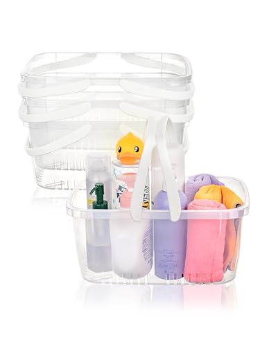 Cetomo Panier de douche en plastique, organisateur de douche avec poignée rabattable, boîte de rangement portale à trous de drainage pour salle de bain, cuisine, dortoir, transparent (lot de 4)