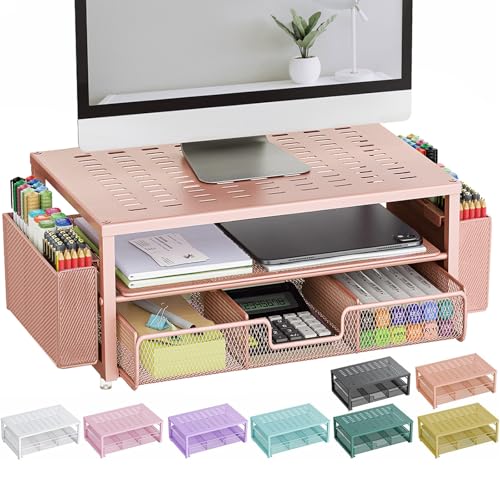 gianotter Support d'écran d'ordinateur de bureau avec tiroir et 2 porte-stylos, organisateur de bureau pour femme, essentiels de bureau à domicile (or rose)