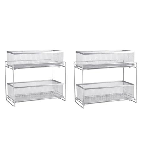 JYPS Lot de 2 Rangement sous Evier, 2 étages Métal Organisateur sous Evier Tiroir Coulissant à Extraction, Rangement Et Organisation de Cuisine, étagère sous placard pour salle de bain, épices(Blanc)