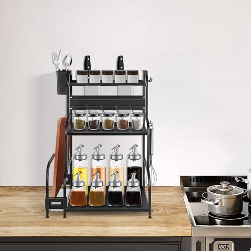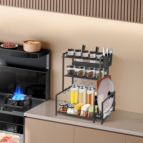 HUOLE Étagère à épices debout, Porte-épices,Étagère de rangement cuisine en métal à 2 niveaux,Étagère à Épices Organisateur sous Evier Salle de Bain Hauteur Réglable (37,4 * 26,5 * 44 cm - noir-1PC)