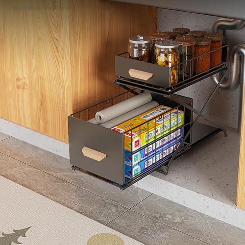 Rangement Sous éVier à 2 Niveaux, Organisateur Etagere Sous Evier Cuisine Avec Tiroirs Coulissants, Panier De Rangement Coulissant En MéTal, Pour Salle De Bain,Placard Cuisine,Bureau,Noir,26x37x38.5Cm