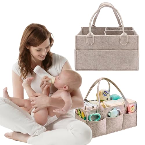 Organisateur de Couches Bébé, 33*18*17cm Organisateur de Couches Portable, Panier de Rangement avec Compartiment Amovible, Pliable en Feutre, pour Chambre de Bébé, Crèche, Voyage en Voiture