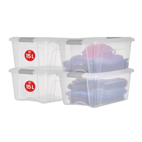 Iris Ohyama, Boite Rangement Plastique avec Couvercle, 15L, Lot de 4, Argent, Clips de Fermeture, Empilable, Organisation, Bureau, Sans BPA, Caisse Rangement Plastique, Bac, NTB-15