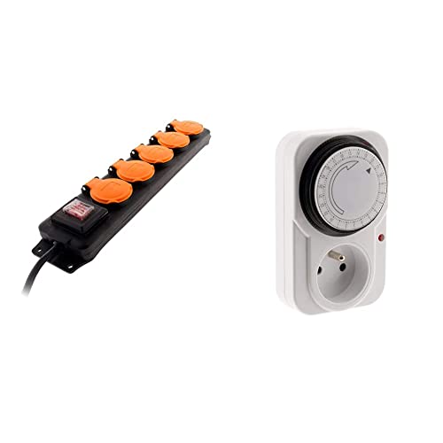 Zenitech Bloc étanche IP44 5 prises 16A 2P+T avec clapets et interrupteur Câble HO5RRF 3G1 de 1,5m & Otio Programmateur journalier mécanique inter. Voyant 3680 W