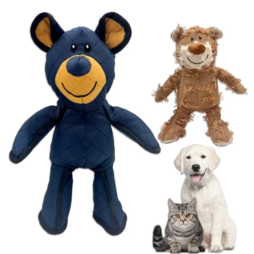 Duuclume Lot de 2 jouets indestructibles pour chien, ours puissant qui couine et interactif, jouet en peluche mignon pour chiens de petite, moyenne et grande taille (bleu, taille L + marron clair,