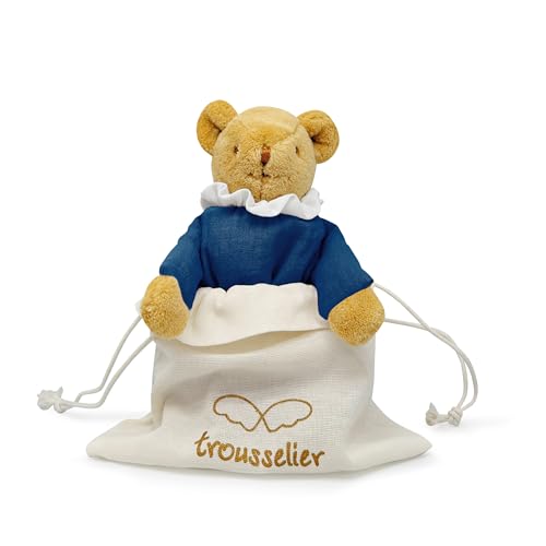 Trousselier - Doudou Bebe Ours Nid d'ange avec Hochet - Ours en Peluche Coton Bio Bleu Foncé - Cadeau Naissance Nouveau Né Garçon Fille - Nounours 20 cm - Doudou Naissance Bébé Mixte