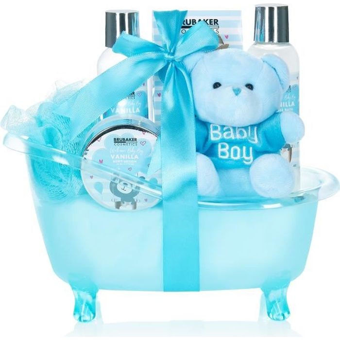 BRUBAKER Coffret Cadeaux de Soins pour Bébé - 7 Pcs - Set de Bienvenue pour Garçons - avec Baignoire et Ours en peluche - Bleu