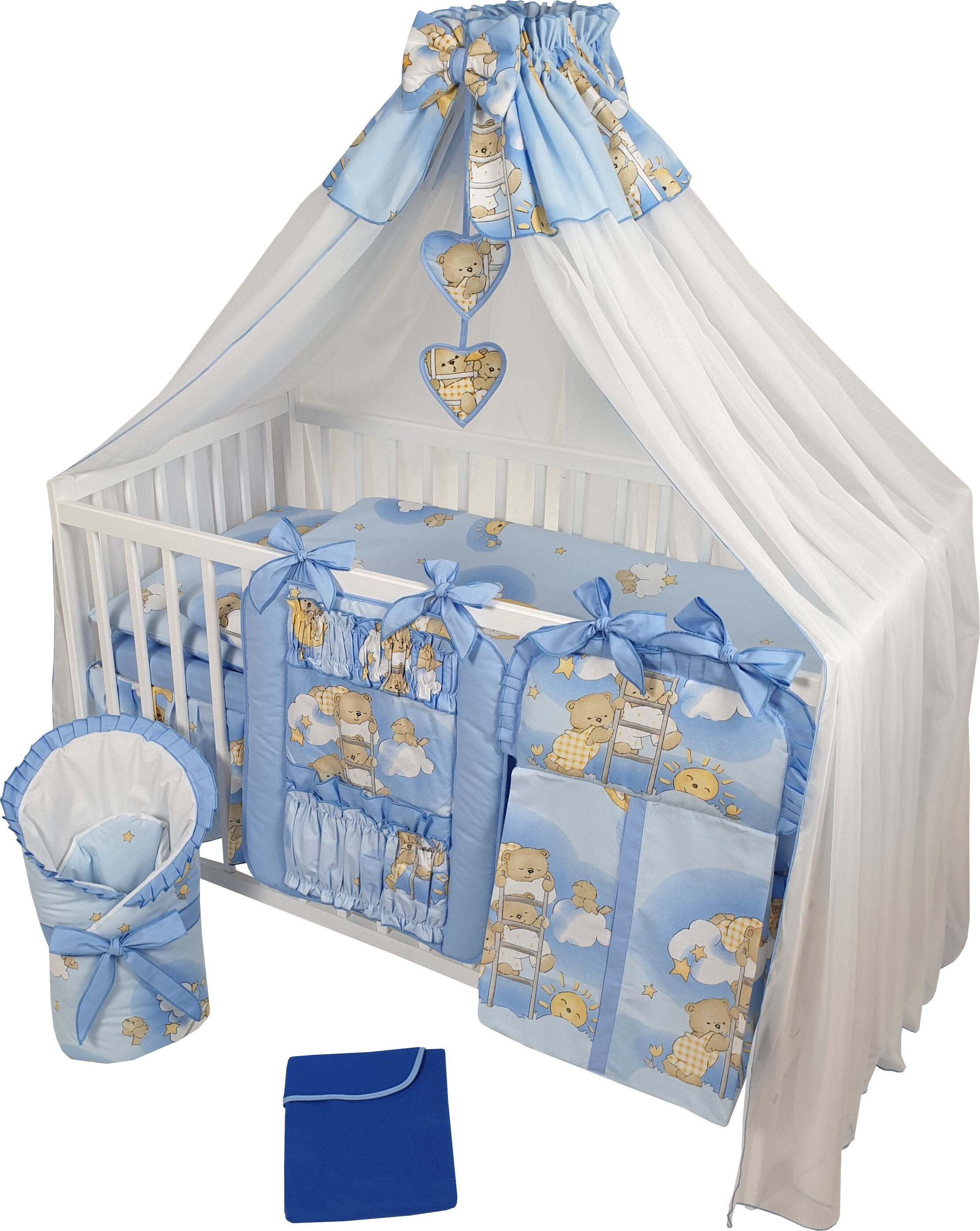 HAPPY 16 pièces lit bébé lit et literie set complet réglable en hauteur en bois massif pour nouveau-nés et jeunes enfants (bleu ours en peluche sur échelle)