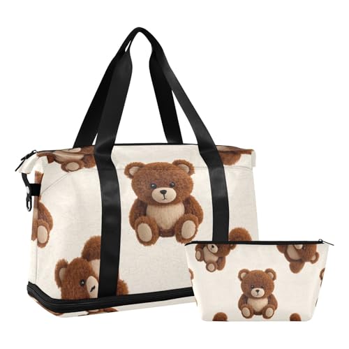 Grand sac de voyage imperméable avec fond beige avec ours en peluche pêche et violet assis au centre