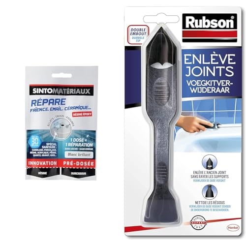 SINTORépareFaïence,Émail,Céramique Blanc-15gde résine+15gde durcisseur & Rubson | Enlève Joints à double embout – Outil pour enlever l'ancien joint sans rayer les supports