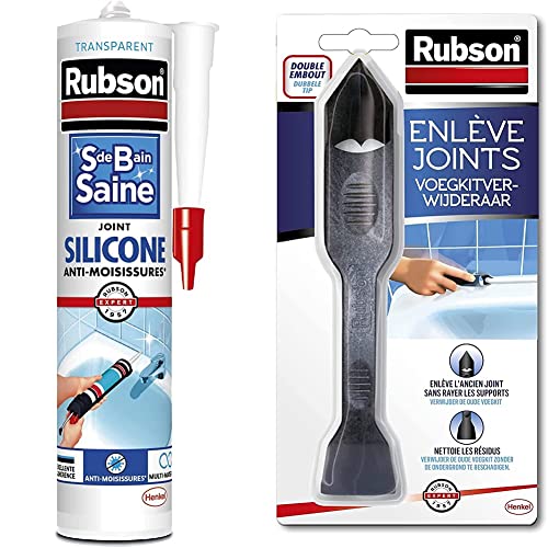 Rubson Mastic Salle de bain Saine Blanc, Joint silicone multi-matériaux renforcé en antifongiques, 280 ml & Rubson Enlève Joint à double embout, Outil pour enlever facilement les joints en silicone