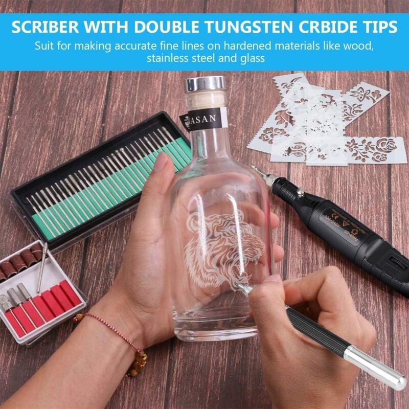 Litzee - Trousse à Outils de Gravure de 60 Pièces, Stylo Graveur Électrique sur Metal, Gravure Bois Electricité avec Scribe,Pochoirs, Outil Graver
