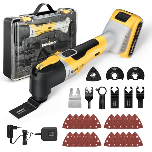 Outil Multifonction Oscillant 20V, ENVENTOR Brushless Outil Multifonction Sans Fil avec 6 Vitesses Variables, 12000-19500RPM, Chargeur, 28 Accessoires, Angle Oscillant 4°, Pour Racler, Couper, Polir