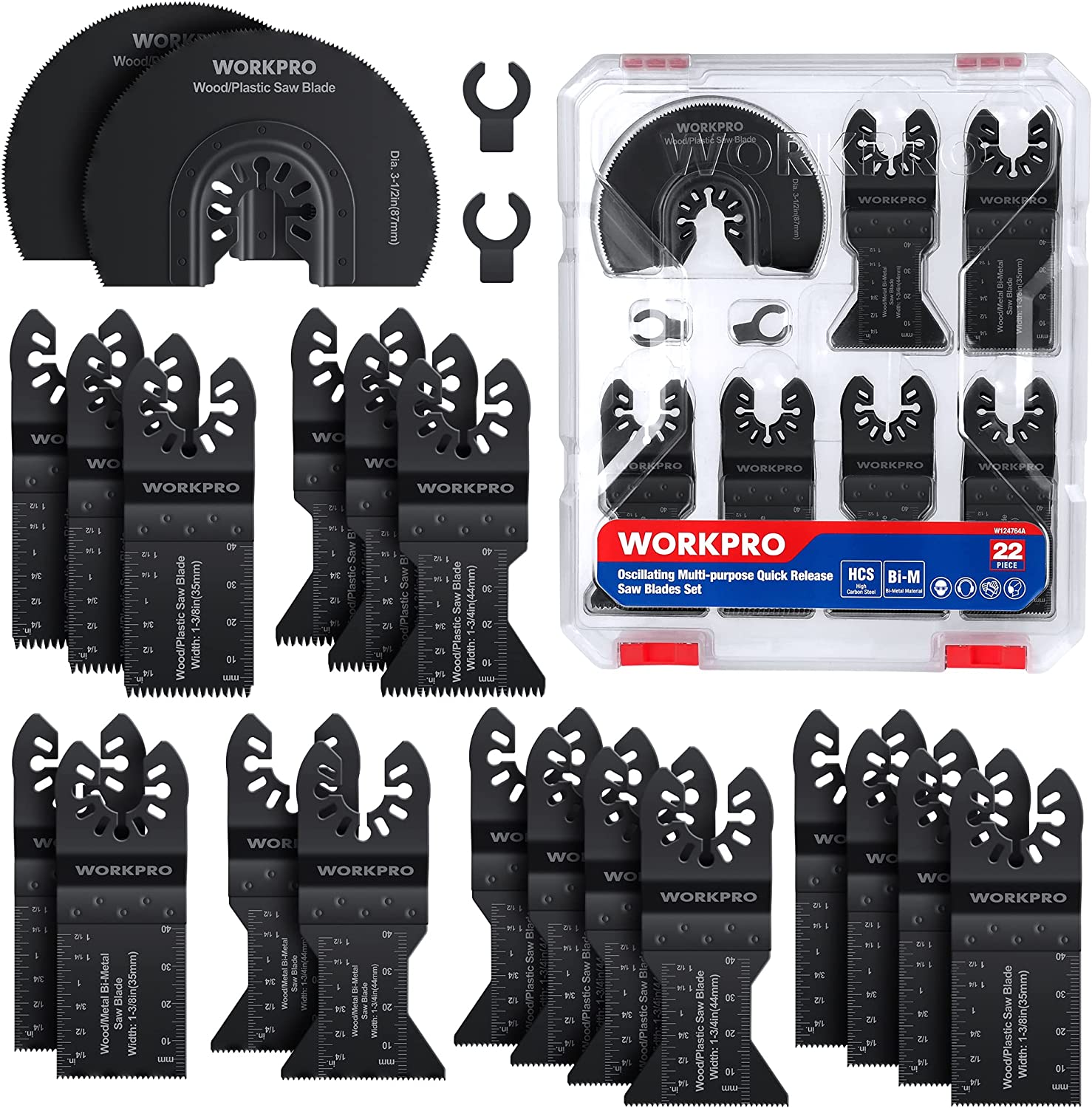 Lame de Scie Oscillante WORKPRO, 22 Pièces Coffret des Accessoires d'Outil Multifonction Oscillant, Lame de Scie Universelle pour Bois, Clous, Métal,Plastique, etc
