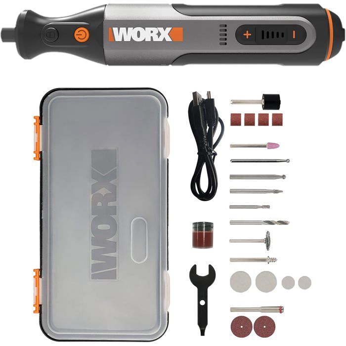 WORX MAKERX Outil Rotatif Multifonction sans Fil 20V WX739, Pour Poncer, Gravir, Polir, Découper, etc, Moteur Brushless, Ergonomique, Livré Avec 1 Batterie 2Ah, Chargeur, Hub et 20 Accessoires