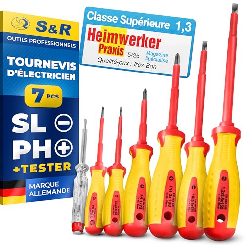 S&R Jeu Tournevis d'Electricien Aimantés Isolés VDE 7 pièces,avec Tournevis testeur. Outillage Electricien mécanique Professionnel