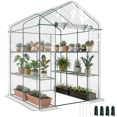 Outsunny Serre de Jardin avec étagères 3 Niveaux, Serre de Balcon, châssis en Acier, Porte zippée Enroulable, pour légumes Plantes Fleurs, intérieur et extérieur, 143x143x195cm, Transparent