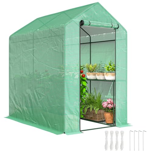 Outsunny Serre de jardin PE avec étagères 4 niveaux, 4,39 m², serre de balcon bâche renforcée 140 g/m², châssis en acier, porte zippée enroulable, pour légumes plantes fleurs, 244 x 180 x 210 cm, vert