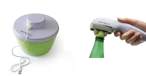 ONE TOUCH Pack Cuisine Confort - Duo Sans Effort : Ouvre-Bouteille Électrique Universel (KC85) + Essoreuse à Salade Automatique Rechargeable (KC128) - Idéal Seniors et Arthrite - Blanc