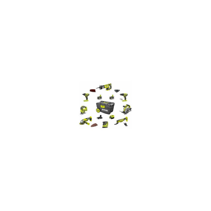 RYOBI - Pack 9 Outils 18V ONE+ : Perceuse, Visseuse à chocs, Meuleuse, Multi-Tools, Pistolet à Colle, Scie Circulaire, Scie Sauteuse, Lampe, Ponceuse + 2 Batteries et Chargeur - R18CK9B-252SLZ