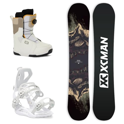 Pack Complet de Snowboard pour Homme XCMAN Chthonic Mirage Premium : Snowboard + Fixations 360 + Bottes Tout-Terrain pour débutants -148 Blanc 360 Blanc Bottes 42.5