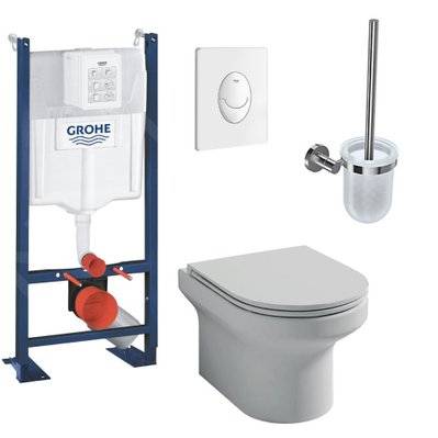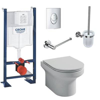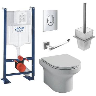 Jacob Delafon Pack WC suspendu sans bride Elite abattant + Bâti support Grohe RapidSL plaque chromé Porte-balai Porte-rou