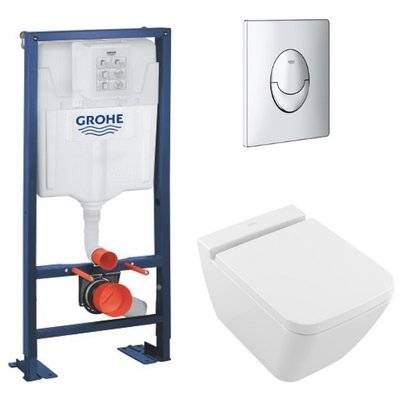 Jacob Delafon Pack WC suspendu sans bride Elite abattant + Bâti support Grohe RapidSL plaque chromé accessoires carrés