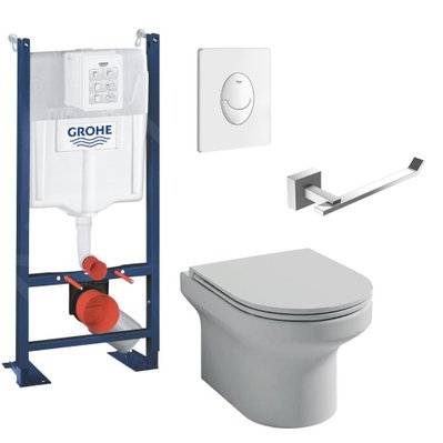 Jacob Delafon Pack WC suspendu sans bride Elite abattant + Bâti support Grohe RapidSL plaque chromé Porte-rouleau