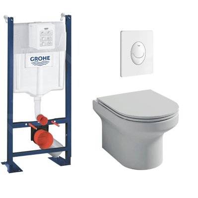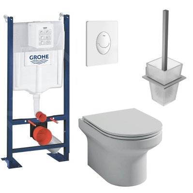 Jacob Delafon Pack WC suspendu sans bride Elite abattant + Bâti support Grohe RapidSL plaque blanche Porte-balai Porte-ro