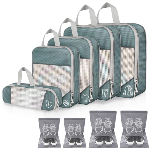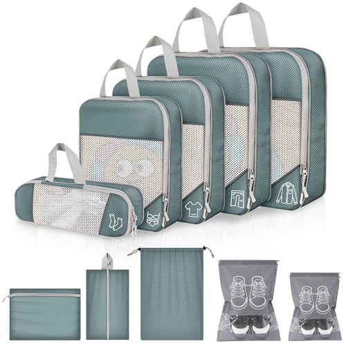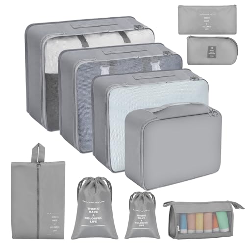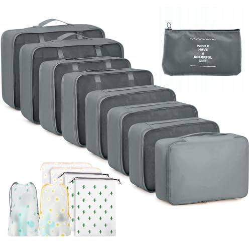 Organisateur Valise, Packing Cubes Compression Sac Rangement Valises, Organiseur de Voyage avec Compartiment Chaussures & Accessoires pour Valise Cabine (Gris 9 Pièces)