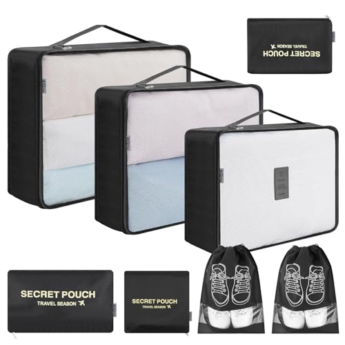 Organisateur Valise, Packing Cubes Compression Sac Rangement Valises, Organiseur de Voyage avec Compartiment Chaussures & Accessoires pour Valise Cabine (Noir 10 Pièces)