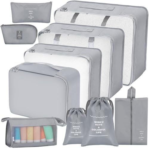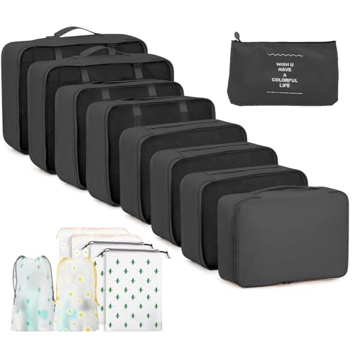 Organisateur Valise, Packing Cubes Compression Sac Rangement Valises, Organiseur de Voyage avec Compartiment Chaussures & Accessoires pour Valise Cabine (Gris 10 Pièces)