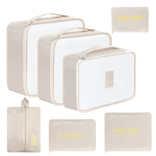 Cozary Organisateur Valise Rangement Valise, 4 pièces Packing Cubes Compression, Fenêtre Transparente – Idéal pour Voyage, Camping - Beige