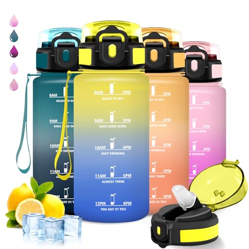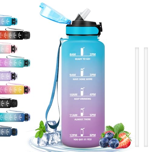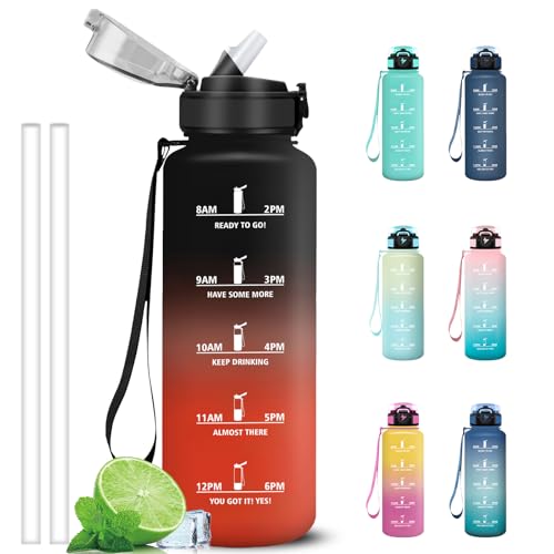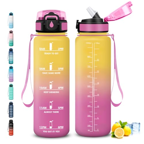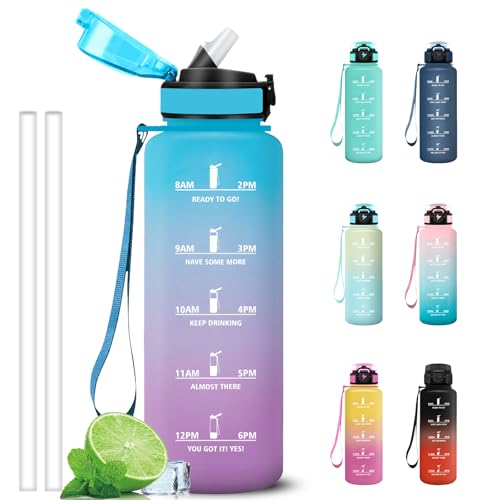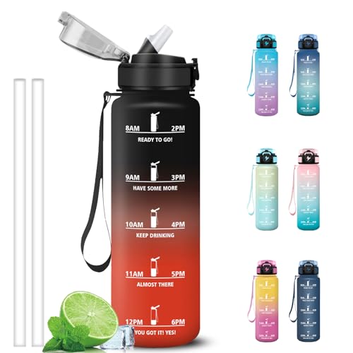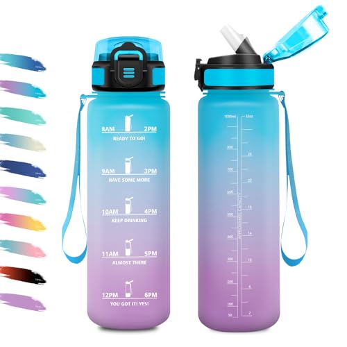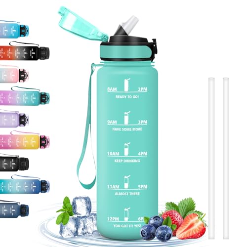 Grsta Gourde Sport 1 litre, Gourdes avec Paille, Verrou de Sécurité, Gourde Graduée pour 1 Journee, avec Marqueur de Temps, Anti Fuite Bouteille Motivation pour Voyages, Velo, Cyclisme
