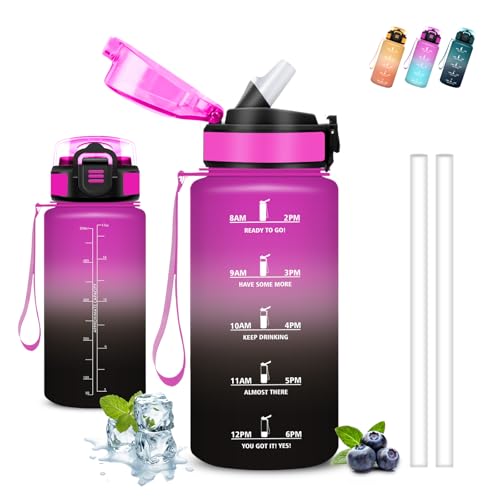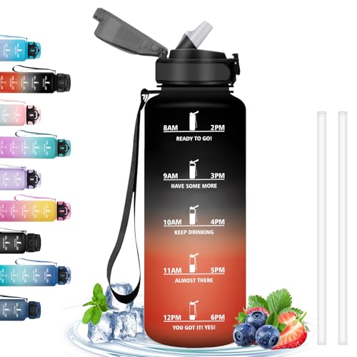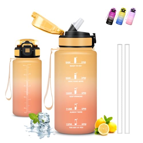 MOMSIV - Gourde de 2 L - Sans BPA - Grande capacité - Anti-fuite - Bouteille d’eau de sport avec paille, marqueurs de temps et couvercle de verrouillage - Carafe d’eau en tritan pour le vélo, l’école