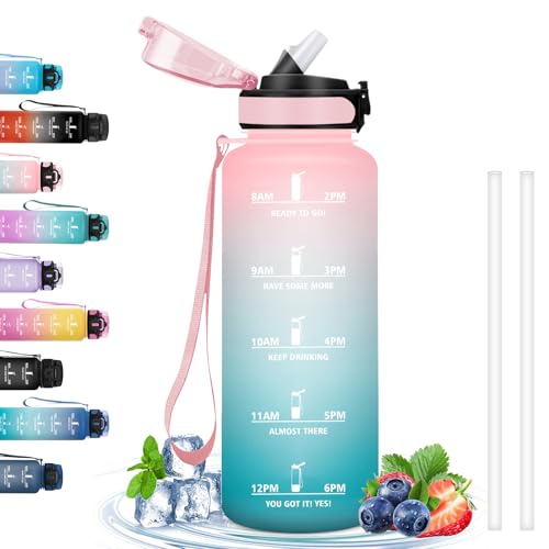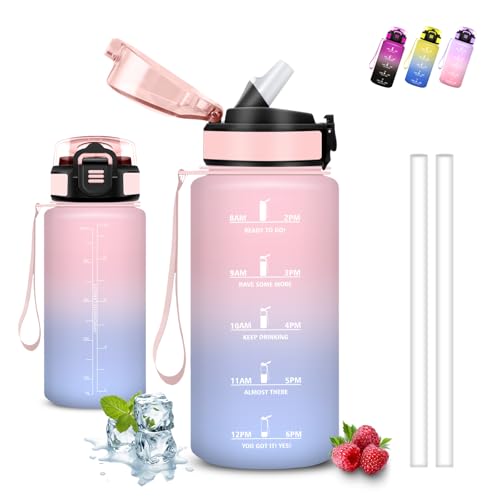 MOMSIV Gourde de 2 l sans BPA, grande capacité, anti-fuite, avec paille, graduations de temps pour boire et verrouiller, pichet d'eau en Tritan pour le vélo, l'école, la gym