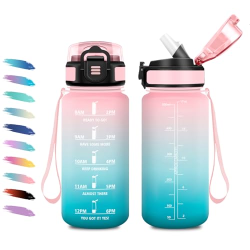 Grsta Gourde 500ml, Gourde Enfant avec Marqueur de Temps, Verrou de Sécurité, Anti Fuite Bouteille Motivationnelle, Facile à Nettoyer, Gourdes avec Paille pour Randonnée, Velo, Gym