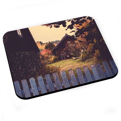 Tapis de souris Maison en bois dans un jardin derrière palissade en bois