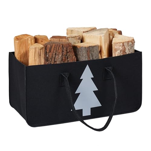 Relaxdays Panier à bûches, Feutre, avec poignées, Sac Rangement Bois, Range-bûches, Motif Sapin, 28 litres, Noir/Blanc