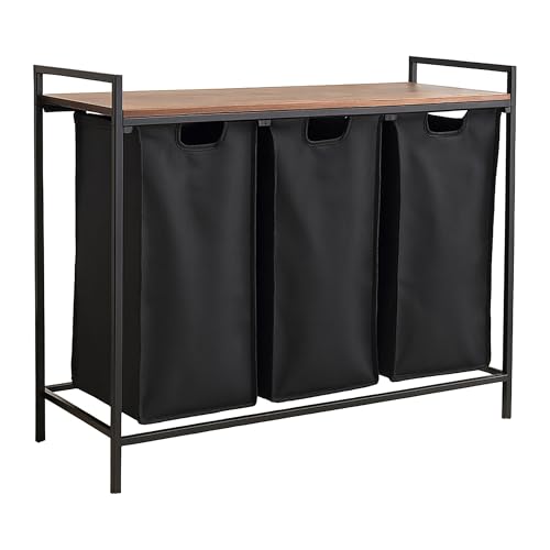 [en.casa] Panier à Linge avec 3 Compartiments Meuble à Linge avec 3 Corbeilles de Grande Capacité et Surface Supérieure Salle de Sain Buanderie Chambre Métal Polyester MDF 76 x 103 x 38 cm Noir