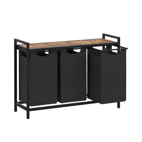 VASAGLE Panier à Linge 3 Compartiments, Corbeille à Linge Sale, 3 Sacs Amovibles en Tissu Oxford, Étagère, Cadre en Métal, 3 x 40 L, 92,5 x 33 x 72 cm, Noir d'Encre et Marron Rustique BLH301B01V1