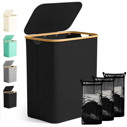 UISEBRT Laundry Baskets Panier à linge avec couvercle, 3 compartiments, 140 l, étroit, pliable, extra large, en bambou, avec couvercle, noir